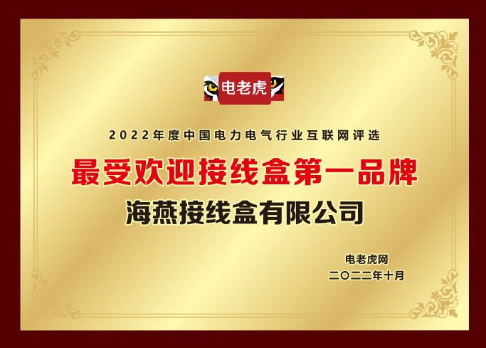 2022年10月12日至10月25日,由江蘇電老虎工業(yè)互聯(lián)網(wǎng)股份有限公司發(fā)起的行業(yè)品牌投票活動(dòng),經(jīng)過十幾天的激烈投票,截止10月25日下午5時(shí),在本次“最受歡迎接線十大品牌”投票中,海燕接線盒始終以高票位于行業(yè)第一位,得到社會(huì)各界人士的普遍認(rèn)可。榮獲“最受歡迎接線盒第一品牌”。