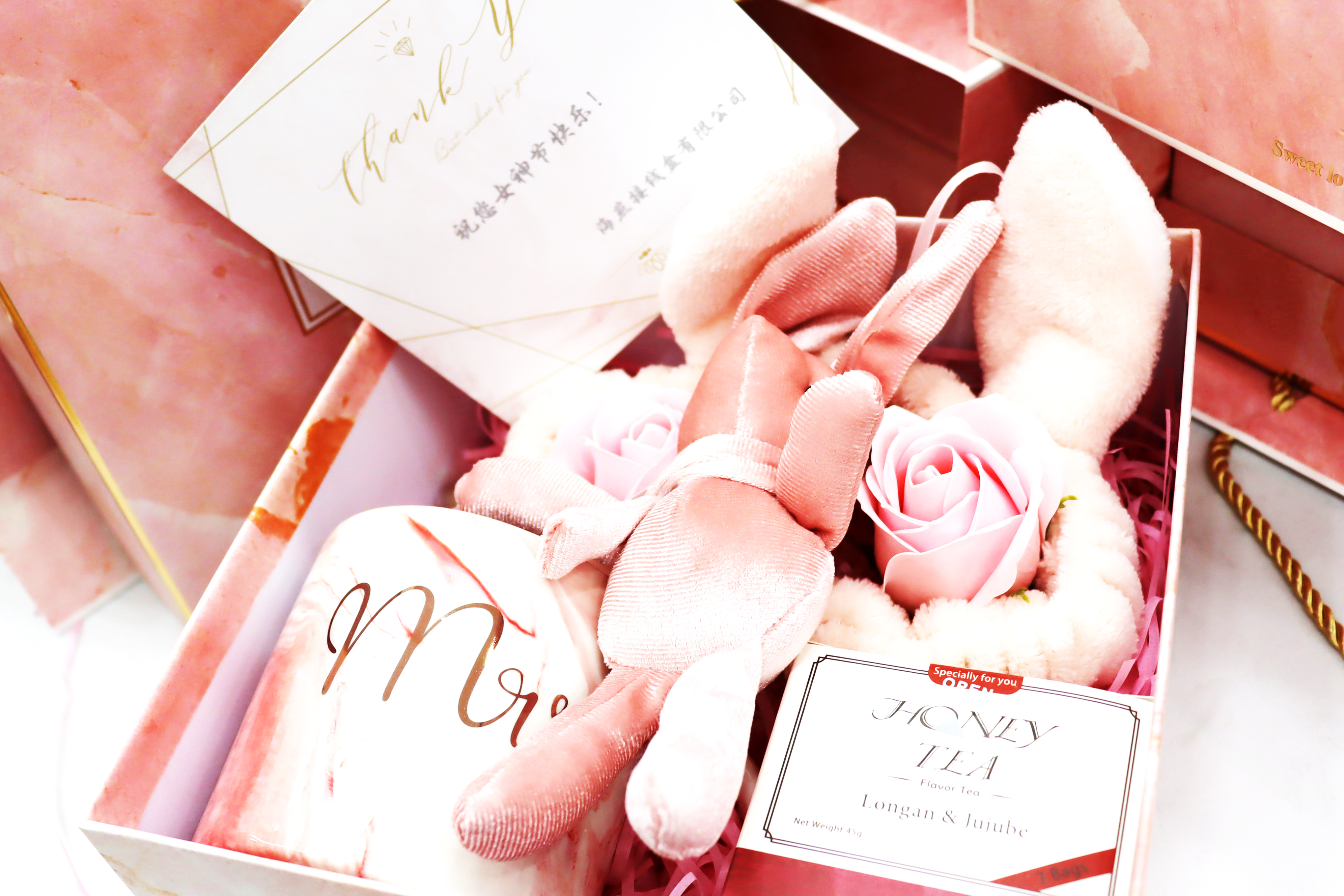 公司同事為女神們精心準(zhǔn)備粉系禮品,這是暖春的顏色,也是友愛的顏色,代表著女神們?nèi)绱喝瞻銣嘏蓯?。禮品主要有鎏金酷炫花紋的瓷杯、精美可愛的玩具兔、絢麗多彩的發(fā)帶,當(dāng)然花是女神節(jié)必不可少的禮物,愿女神如花般絢爛。